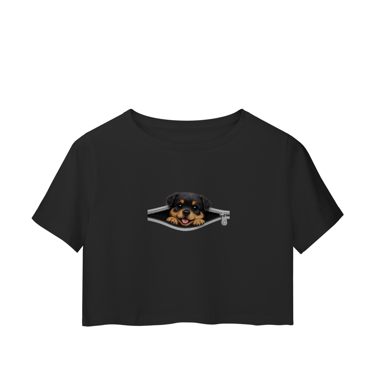 O Cropped ZIP PETS – Cute Puppy Rotweiler faz parte da coleção ZIP PETS, uma linha criativa que traz pets curiosos surgindo através de um zíper, criando um visual divertido, moderno e cheio de personalidade.
